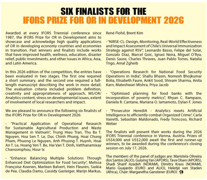 Este premio, otorgado cada tres años por la International Federation of Operational Research Societies (IFORS), distingue trabajos que aplican investigación de operaciones para abordar desafíos críticos en países en desarrollo, con impacto en áreas como salud, seguridad, alimentación y políticas públicas.